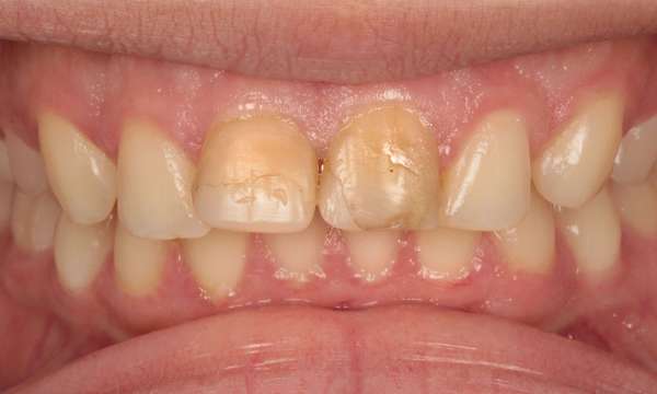 This patient came in with old restorations that were heavily stained and starting to break down. We restored both front teeth with cosmetic crowns, giving them strength, beauty, and confidence again.